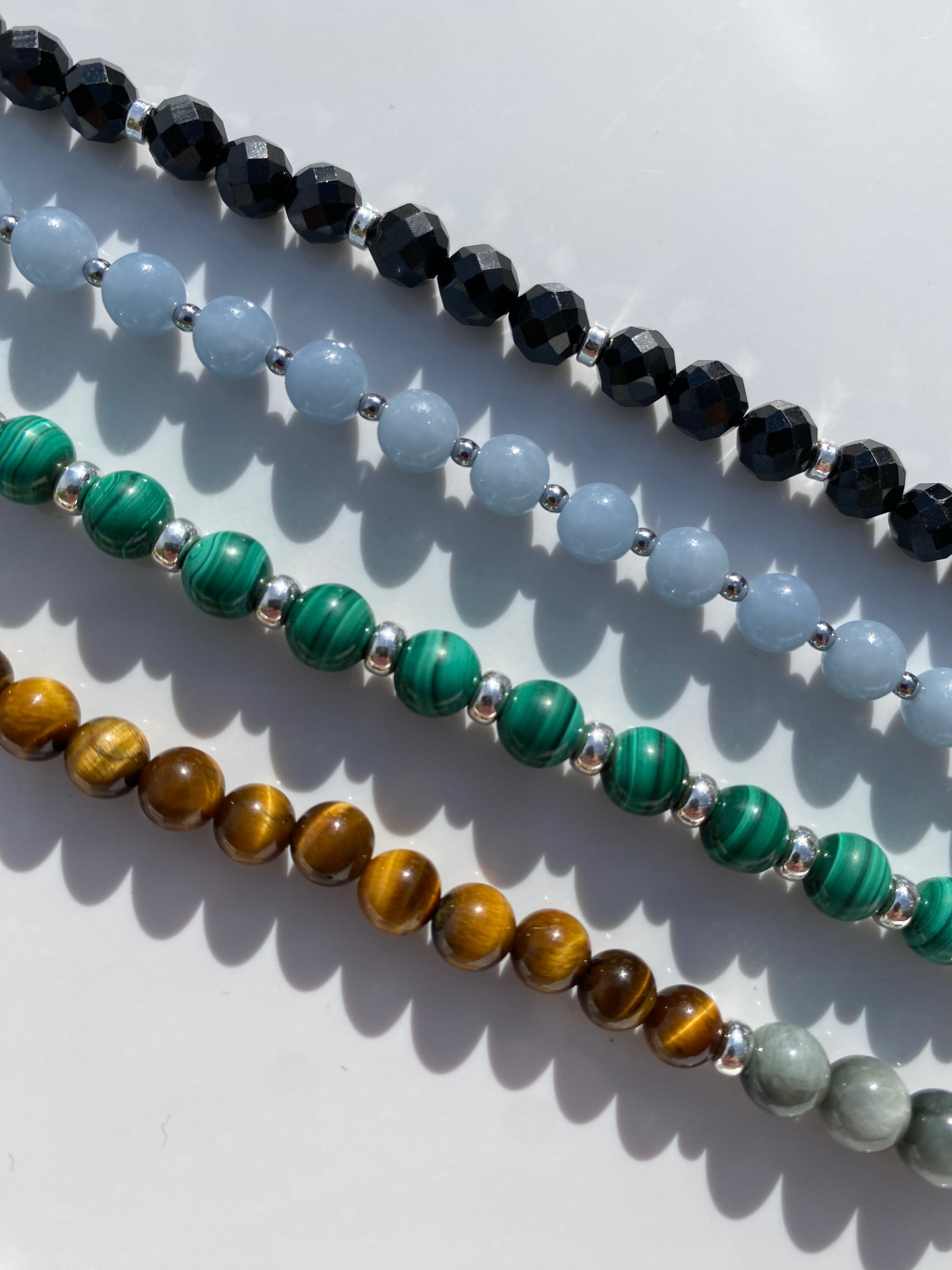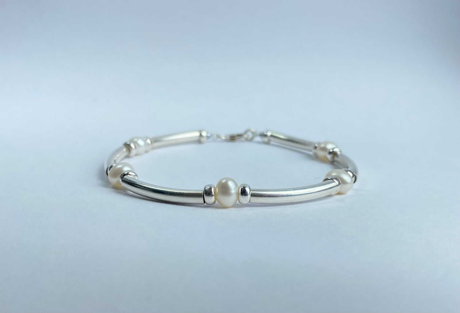Des bracelets en perles naturelles de qualité choisies pour leur éclat, montées sur fil câblé et apprêts en argent.